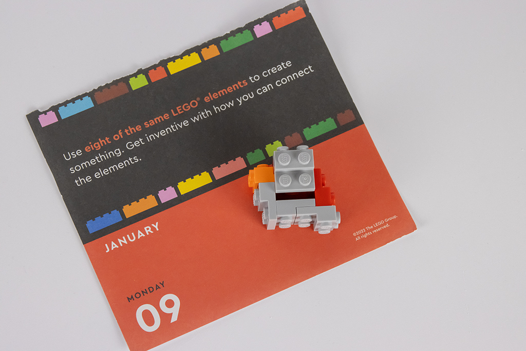 Der Auftrag war mit acht gleichen LEGO Elementen etwas zu bauen. "Etwas" ist natürlich etwas vage 😉 Also habe ich einfach in die Kiste mit den Teilen gegriffen, die noch von der letzten Aufräumaktion nicht aufgeräumt waren und mir die Teile genommen, wovon acht Stück vorhanden waren. Und dann expermientiert wie ich die Teile auf unterschiedlichste Art zusammenbauen kann. Es kam dabei zwar nichts gegenständliches heraus, aber es höchts spannend, wie man mit diesen Teilen bauen kann - und wie nicht. Der finale Entwurf stammt von meiner Tochter, die dazu kam und es auch mal probieren wollte.