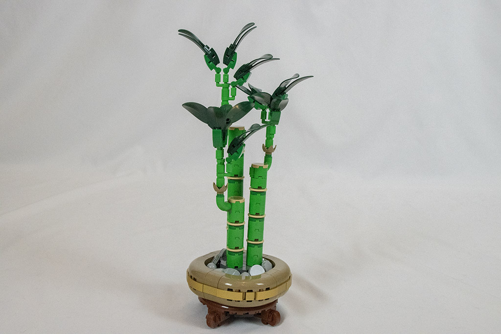 Die Technik mit den Töpfen finde ich immer noch fantastisch gelöst. Der goldene Streifen in der Mitte gibt dem Topf einen eleganten Look. Im Topf liegt unten eine Art Münze. Da es auch bei uns den „Glückspfennig“ oder jetzt „Glückscent“ gibt, vermute ich, dass es Glück bringen soll. Die Stängel des Bambus sind mit den beigen Einschnürungen gut zu erkennen. Auch die Blätter passen gut. Insgesamt ist der Bambus auf den ersten Blick als solcher zu erkennen.