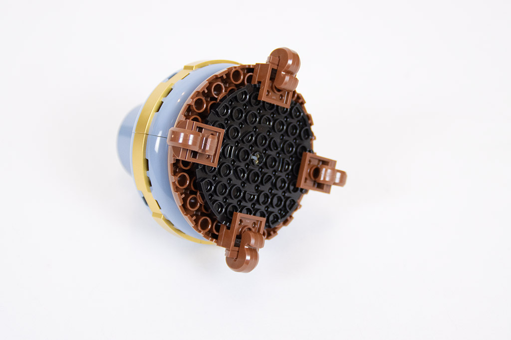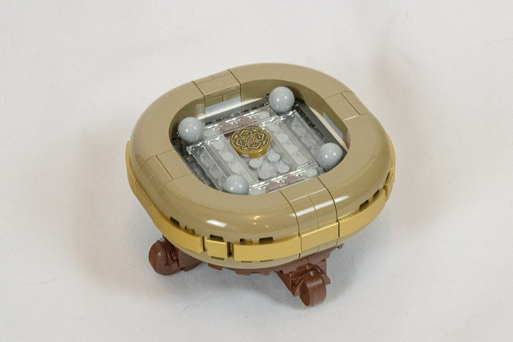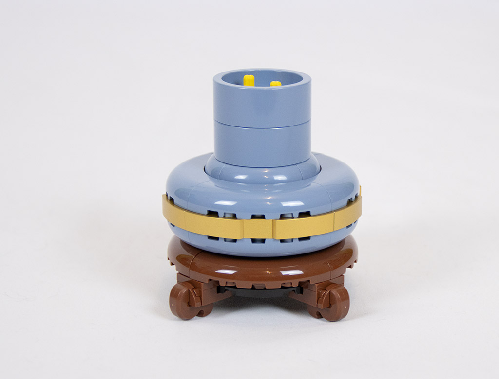 Der Topf ist von der Bautechnik her sehr interessant. Für das Design müssen die Steine in genau gegengesetzte Richtungen gebaut werden. Das ist klasse gelöst. Mit dem goldenen Streifen sieht das ganze auch recht edel aus. (Soweit man bei einem Plastikspielzeug von edel reden kann.) Am besten gefallen mir jedoch die Füße. J