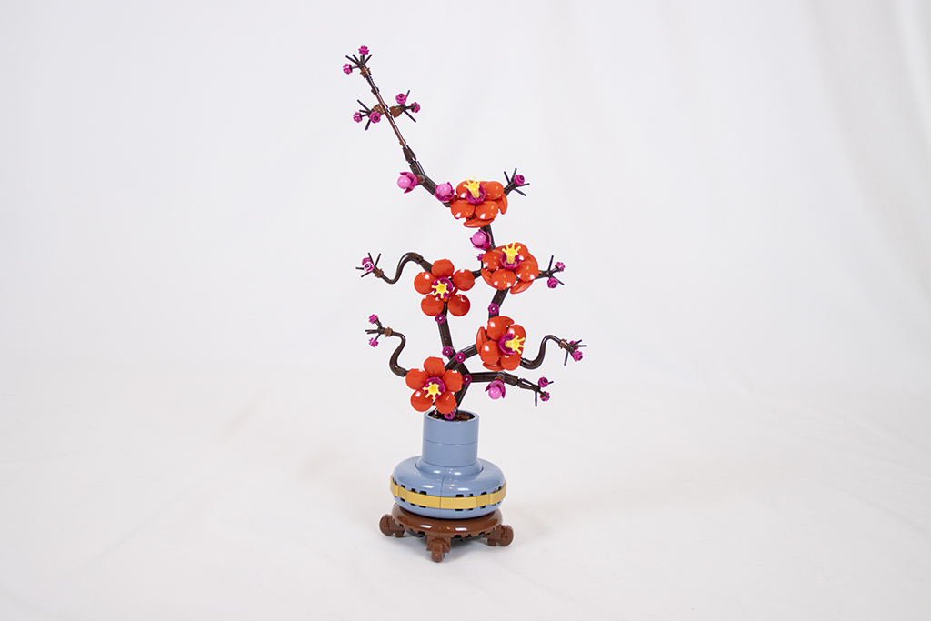 Bei den Zweigen muss man gut aufpassen, dass man alles korrekt zusammensteckt und nichts vergisst. Es gibt eine extra Seite wo im 1:1 Maßstab abgedruckt ist, wie der jeweilige Zweig aussehen soll. Das ist hilfreich. Auf beide Zweige verteilt gibt es die Pflaumenblüten in verschiedenen Stadien: Knospe, leicht offen, ganz offen. Wenn alle Blüten fertig sind und an der korrekten Stelle befestigt, sieht das wirklich hübsch aus. Auf Grund der Bauweise sehen die Äste nur von einer Seite richtig gut aus. Die Rückseite ist etwas leer. An der einen oder anderen Stelle hätte man vielleicht auf der Rückseite eine Blüte ergänzen können. Aber ob das dem Gesamtbild dienlich gewesen wäre, wage ich zu bezweifeln. Denn die Blüten haben auch eine Schokoladenseite…