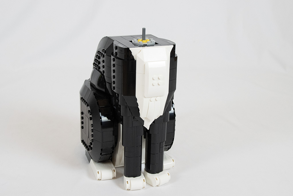 Die Vorderpfoten sind drehbar und somit lässt sich die Katze in eine sehr natürliche Position bringen. Auch der Kopf ist beweglich. Neben der Augenfarbe (nebenbei bemerkt: wirklich schöne Drucke und neue Teile! Da bin ich gespannt was die vielen fantastische MOCer damit machen werden) lässt sich auch die Mundpartie anders gestalten. Ich habe mich für den leicht geöffneten Mund entschieden. Die Teile für beide Versionen liegen bei und so kann man sich später auch noch unentschieden. Auch an der fertigen Katze lässt sich das noch tauschen.