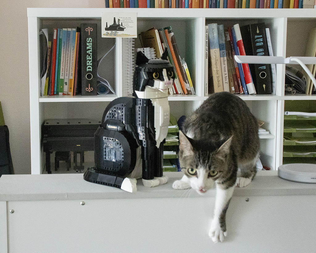 Der Schwanz wird als letztes gebaut und kommt mir von allen Bauteilen am fragilsten vor. Die fertige Katze hat eine ordentliche Größe, sollte aber vorsichtig transportiert werden. Mir ist beim „Umzug“ zu Fotostand ein Bein abgefallen. Danach habe ich etwas mehr aufgepasst und es hat sich dann nichts mehr gelöst. Unsere zierliche Kätzin ist tatsächlich größer als die LEGO Katze. Und süßer. Sorry LEGO, aber an eine echte Katze kommt diese natürlich nicht heran. Einziger Vorteil ist: Sie haart nicht und stellt nichts an.