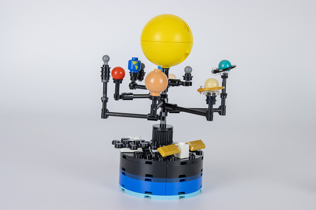 Noch bevor der Aufbau losging, kamgleich eine Beschwerde: Der Saturn ist viel zu klein! Auch mein Hinweis, dass das den Ringen geschuldet ist, wurde einfach weggewischt. Nein! Das geht nicht. Und sie findet das doof. Eigentlich finde ich es sogar gut, dass sie so hartnäckig bei ihrer Meinung bleibt. Und ich vermute, dass man es auch anders hätte lösen können. Die falsche Größe des Saturn ist von wissenschaftlicher Seite nicht der einzige Makel. Das ganze Modell ist nicht ansatzweise maßstabsgetreu. Da das auch nicht der Anspruch dieses Sets ist, schauen wir also darüber hinweg und bedauern die armen LEGO-Erdlinge nicht, dass sie jämmerlich verbrennen würden. Dafür wurde der Pluto spendiert, worüber sie sich gefreut hat. Obwohl der schon lange vor ihrer Geburt degradiert wurde, hat sie die Geschichte irgendwie mitgenommen und sie weigert sich den armen Pluto nicht mehr als Planeten anzusehen. In der Produktbeschreibung steht übrigens „7 drehbare Planeten“. Entweder können wir oder die Leute bei LEGO nicht zählen. Selbst wenn man den Zwergplaneten nicht mitzählen würde, wären es trotzdem 8 Planeten.