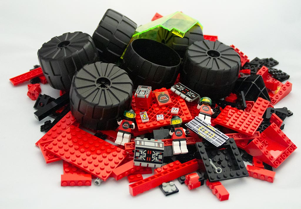 Das ist mal ein Haufen Steine. Und große Räder. Die Räder finde ich auch heute noch cool. Diese großen Teile haben einfach was. Wie schon bei den anderen Sets der Reihe sind die Teile bedruckt. Ein paar schöne sind zur Demonstration hier in der Mitte zu sehen.